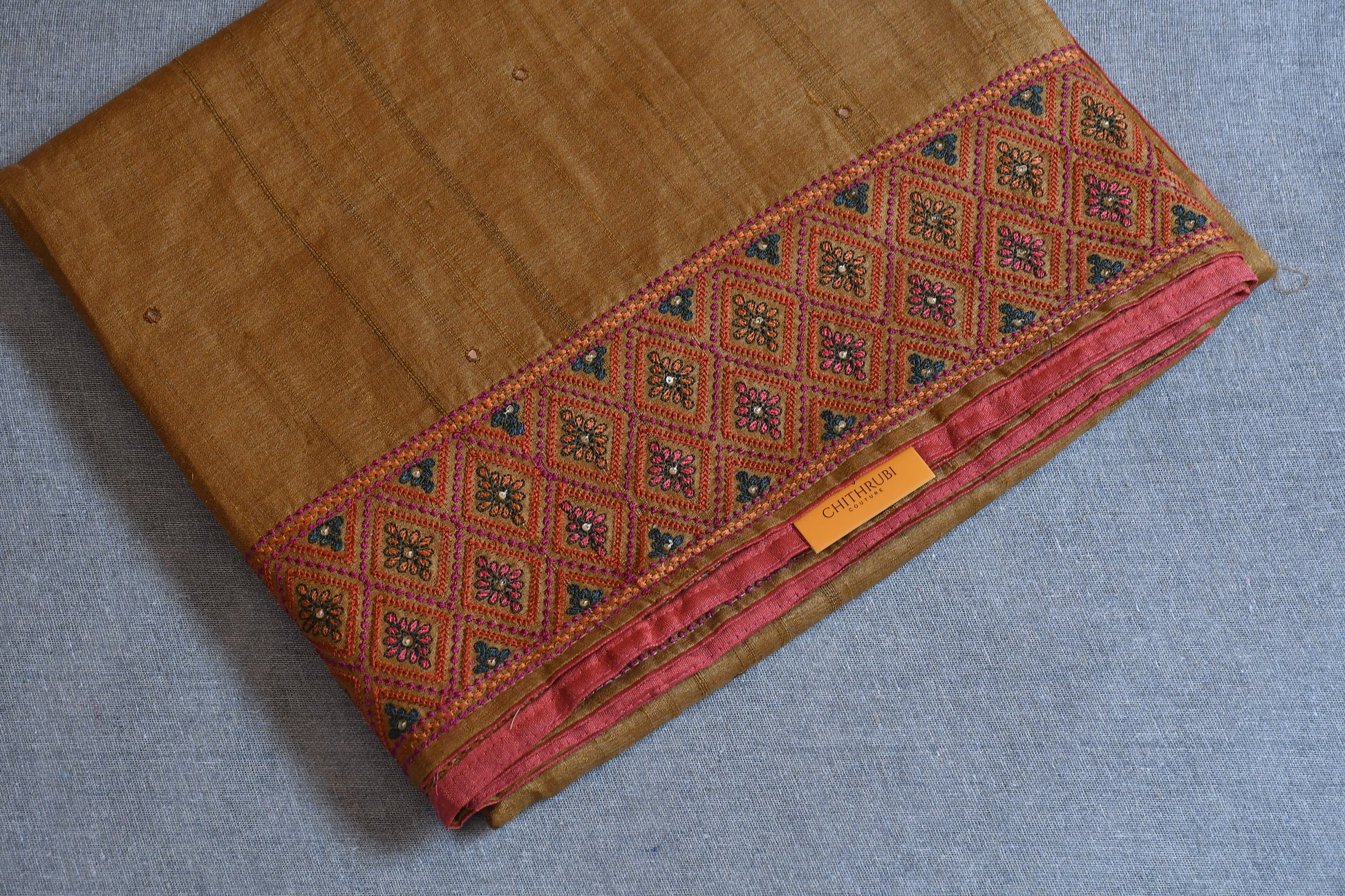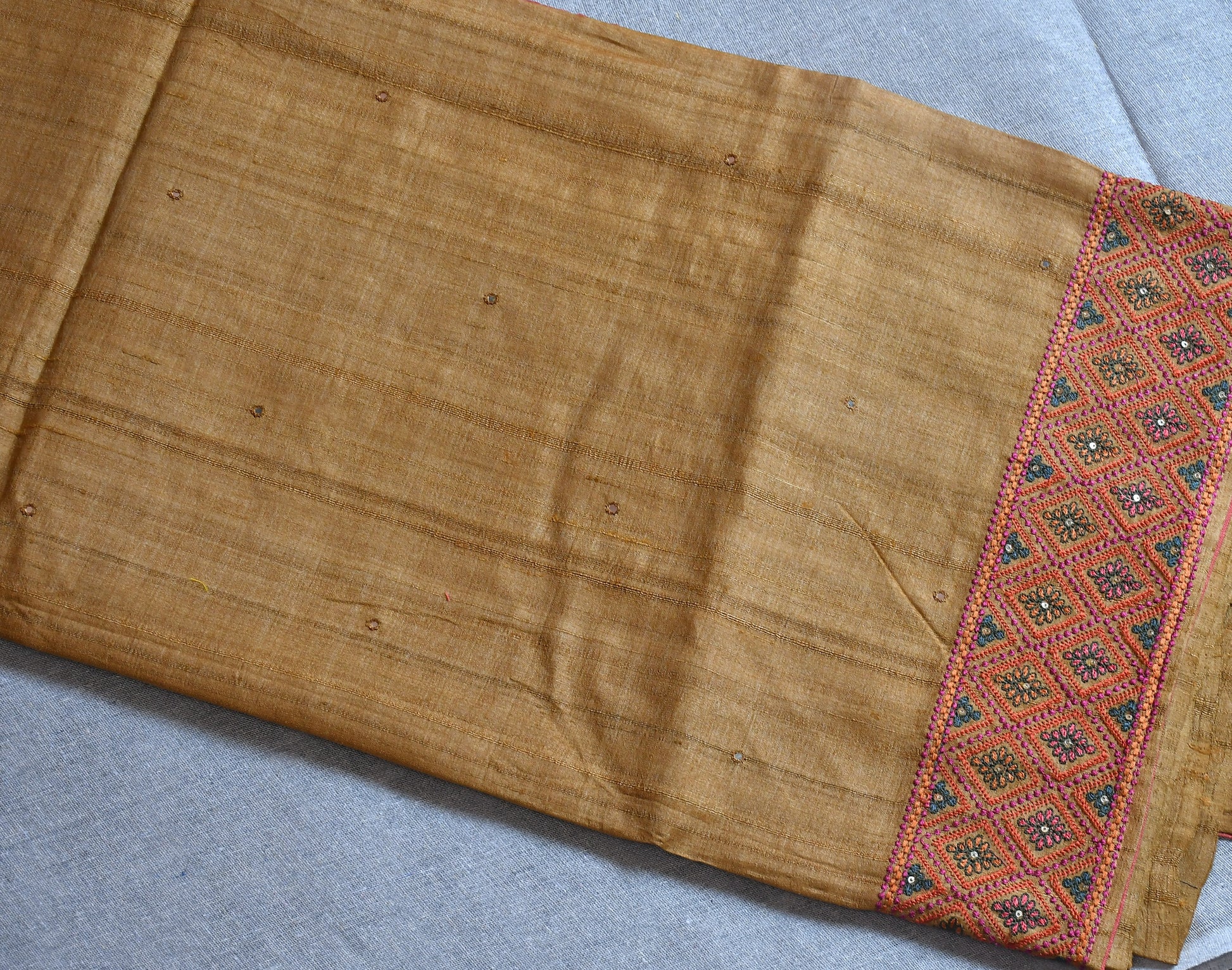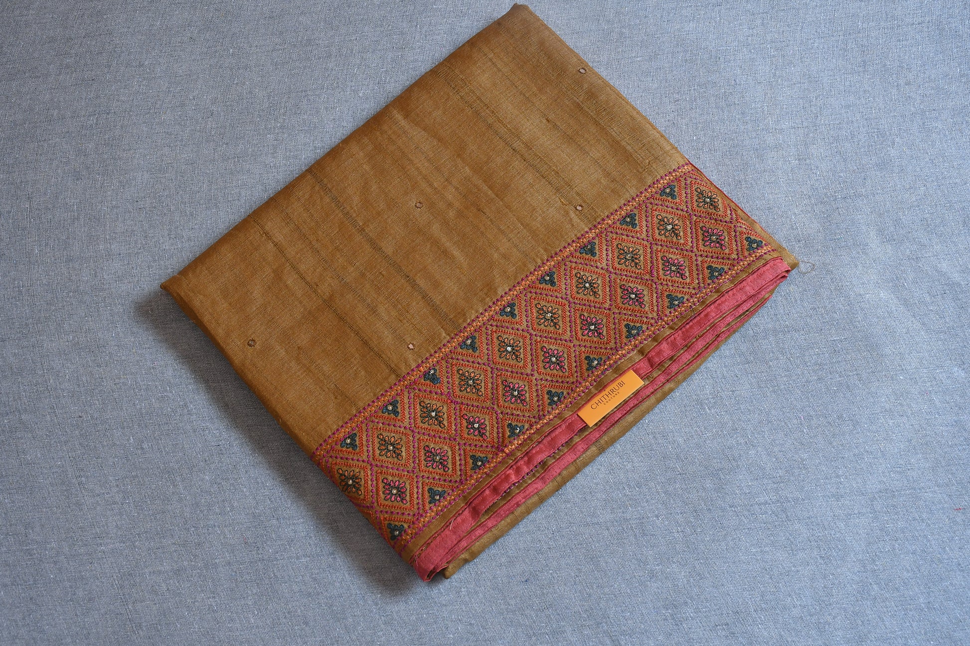 Experience the charm of tradition with our Pure Tussar Silk Saree, woven from natural Tussar fibers known for their rich texture and golden sheen. This saree is adorned with intricate hand embroidery, adding grace without overpowering its natural elegance.