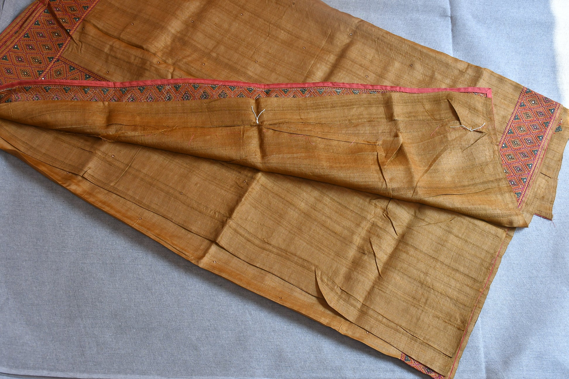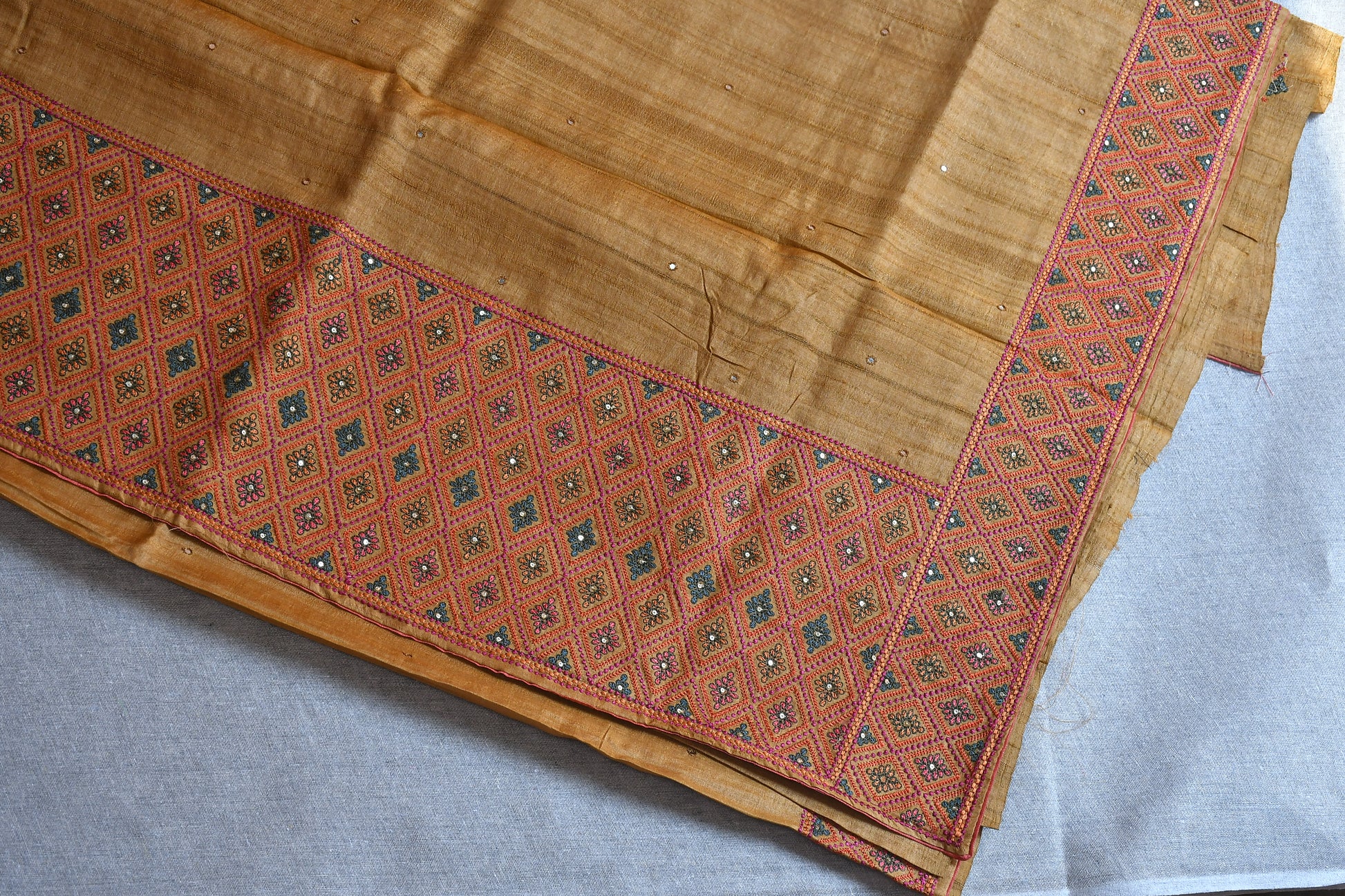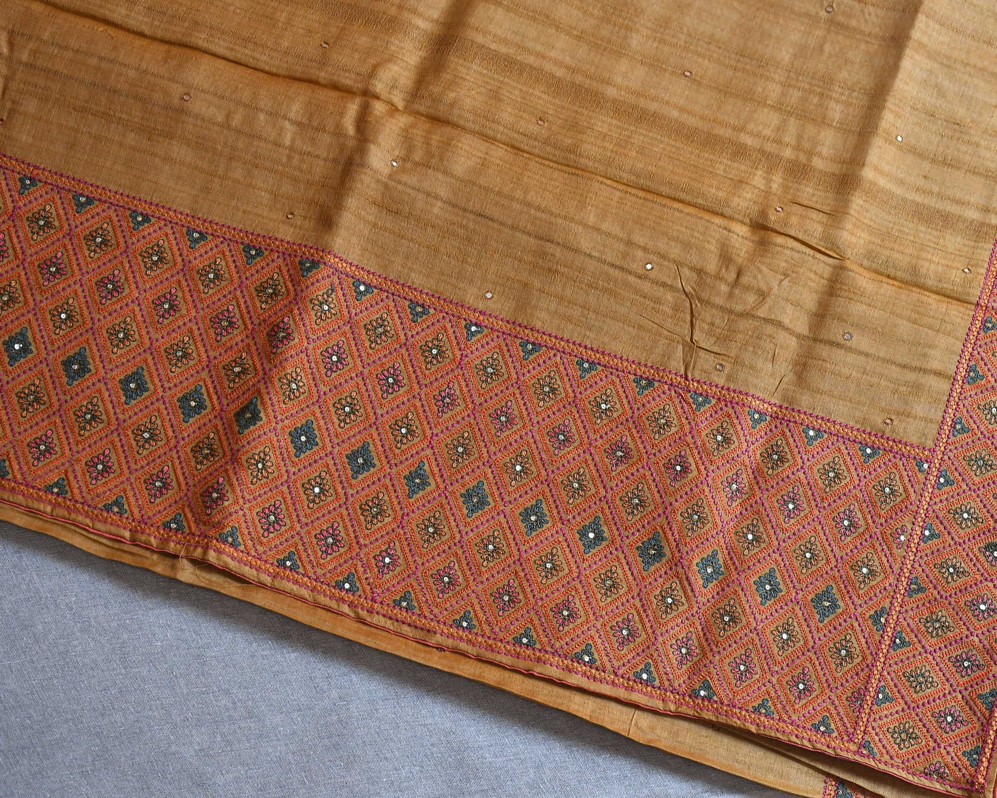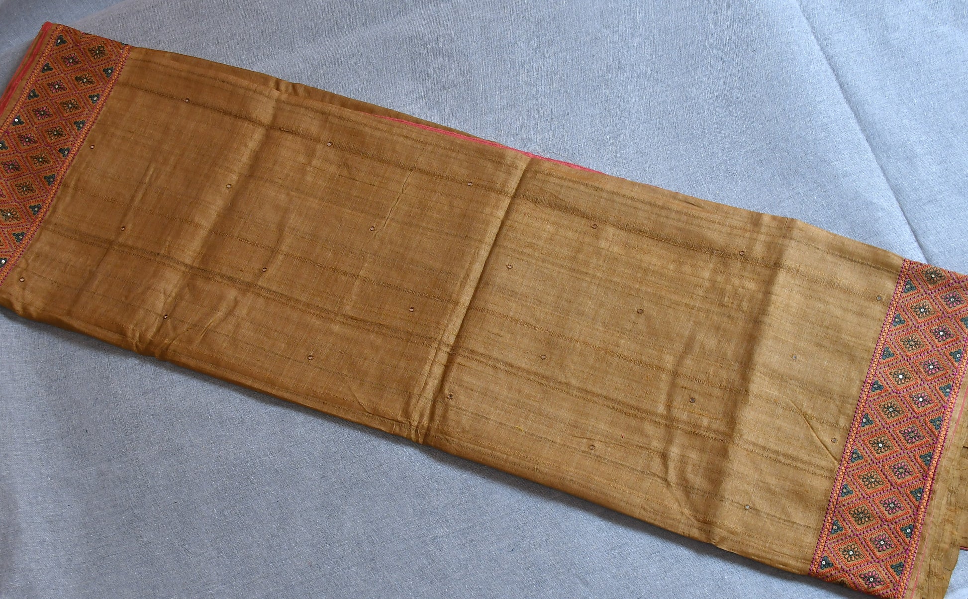 Experience the charm of tradition with our Pure Tussar Silk Saree, woven from natural Tussar fibers known for their rich texture and golden sheen. This saree is adorned with intricate hand embroidery, adding grace without overpowering its natural elegance.