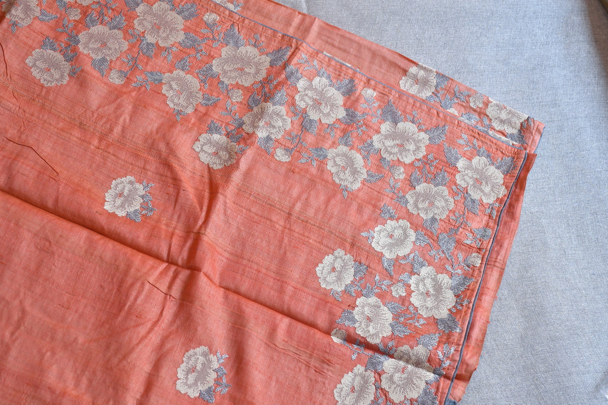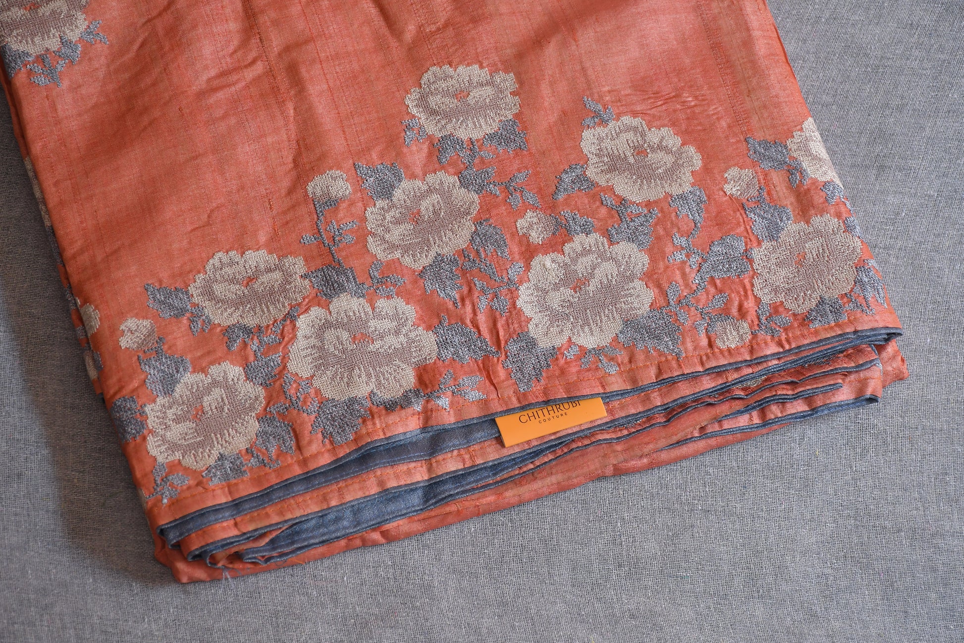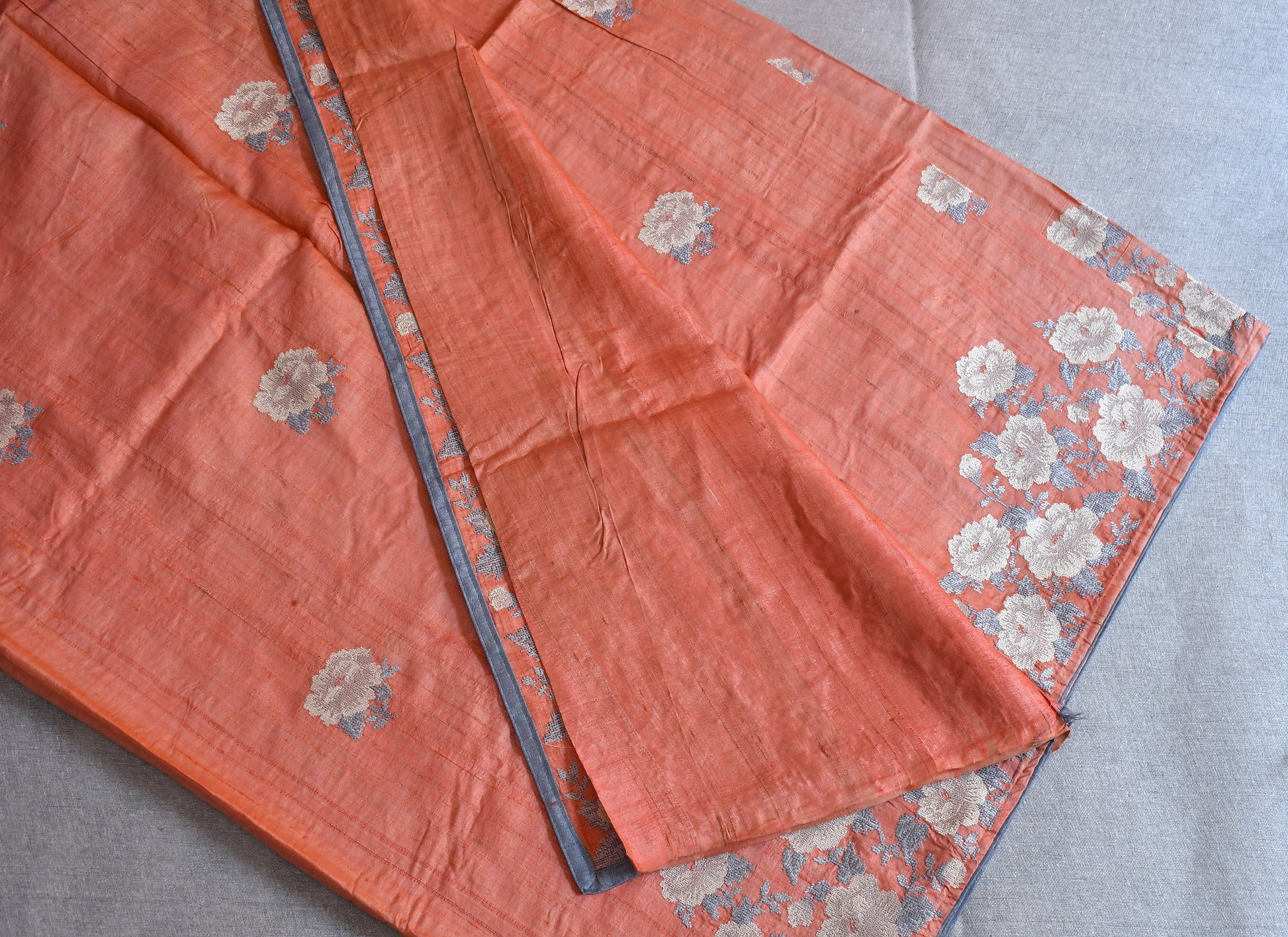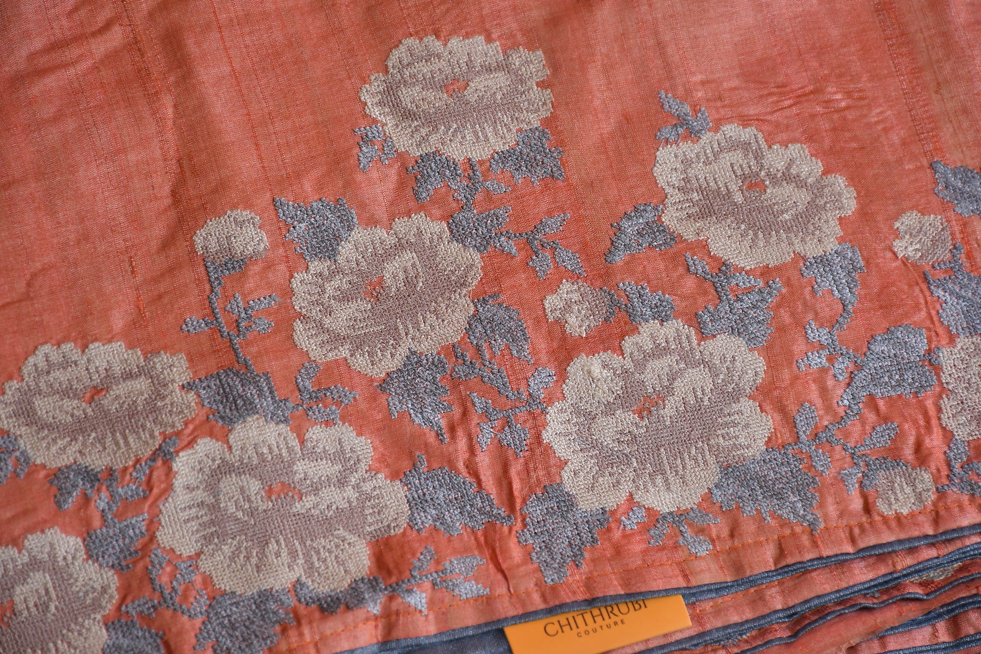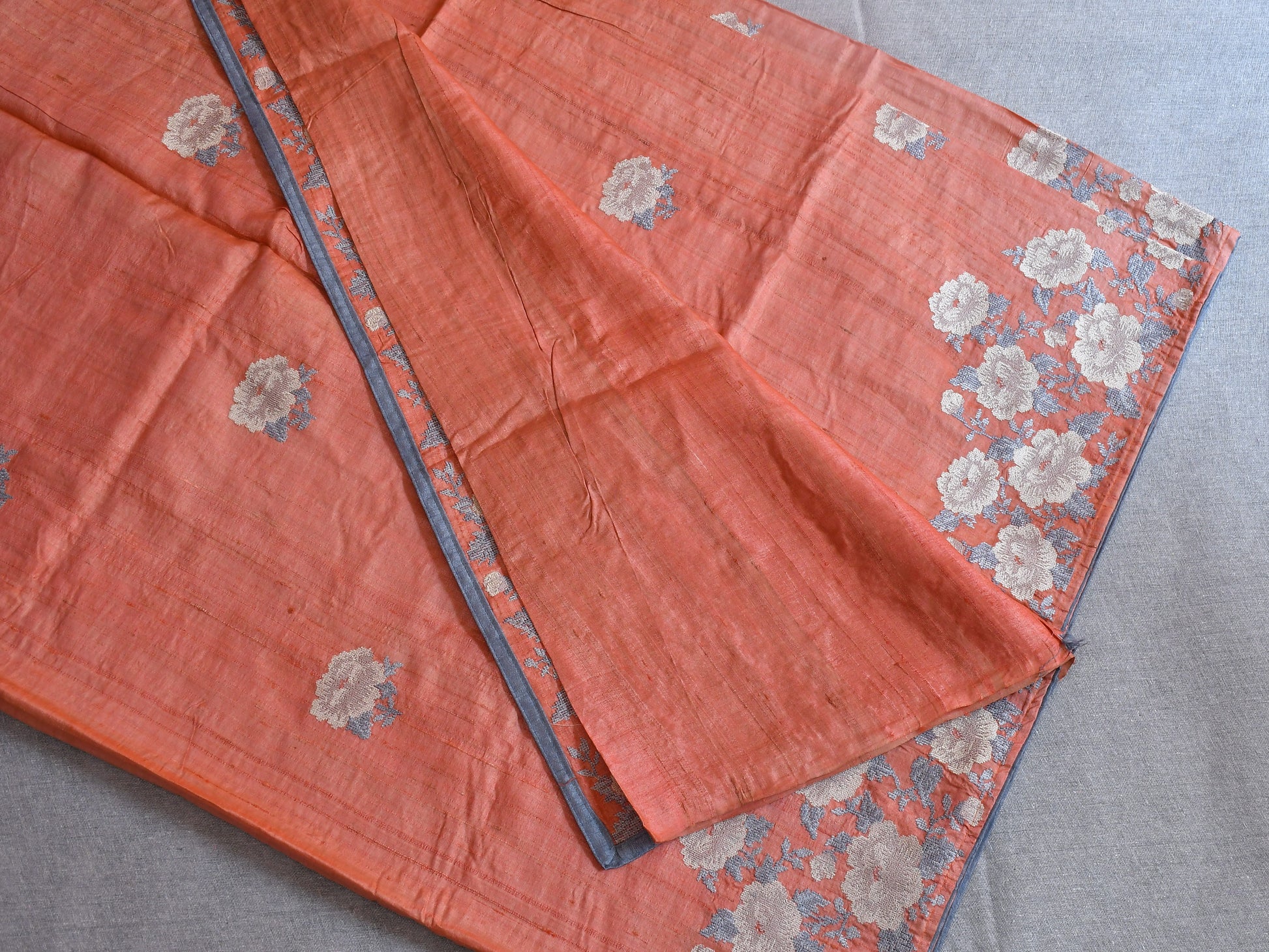 Experience the charm of tradition with our Pure Tussar Silk Saree, woven from natural Tussar fibers known for their rich texture and golden sheen. This saree is adorned with intricate hand embroidery, adding grace without overpowering its natural elegance.